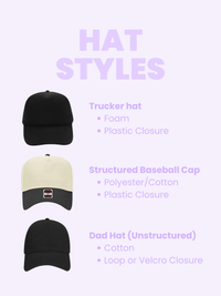 - style of hat (ex: basebcall cap or trucker hat)